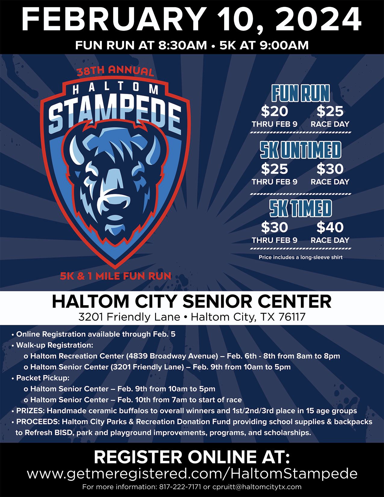 The fun run starts at 8:30 a.m. followed by the 5K at 9:00 a.m. The proceeds from this year's race will go directly to the Parks & Recreation Donation Fund which pays for the Refresh BISD Back to School Health Fair, school supplies, afterschool programming and scholarships for students in Haltom City. Winners in 15 age groups will win the coveted handmade ceramic buffalos! For more information contact Parks Director Christi Pruitt or call 817-222-7171.